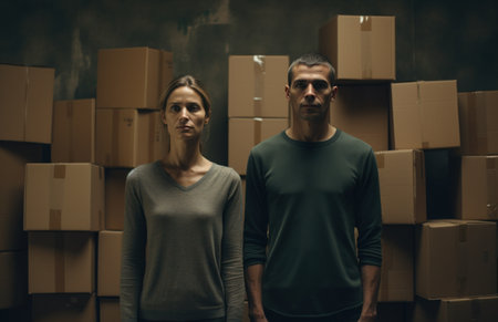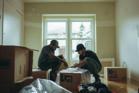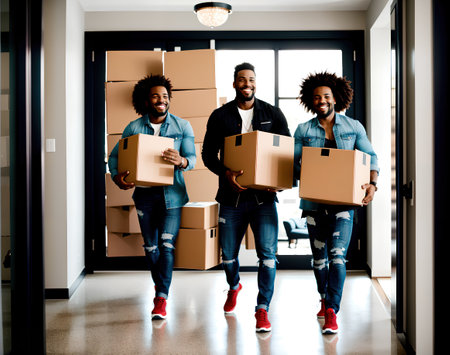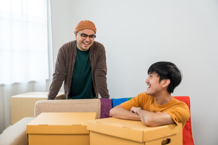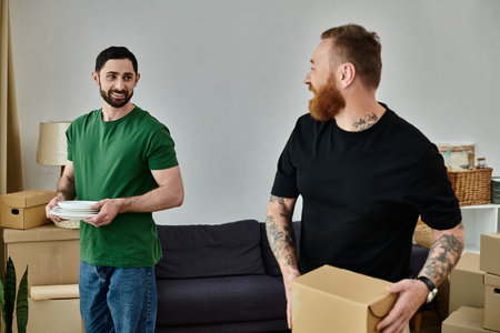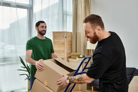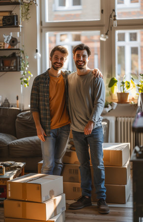 A gay couple in love unpacking boxes in their new home, symbolizing relocation and new beginnings.
