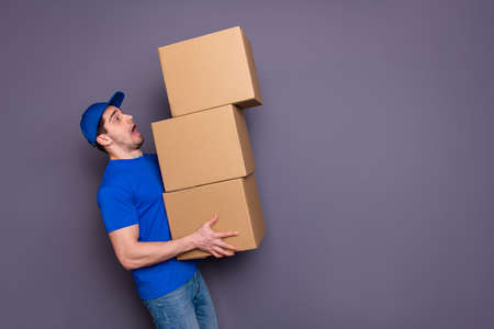Close up photo profession specialist he him his delivery boy hold strong hands, large big heavy parcel boxes flat move exhausted stressed wear blue t-shirt cap jeans denim isolated grey background