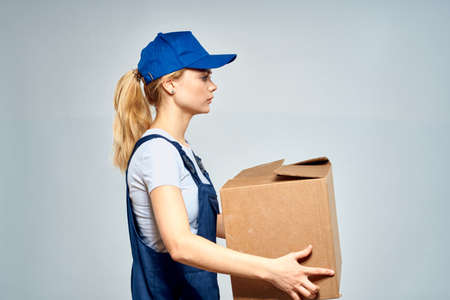A woman in a working uniform with a box in the hands of a delivery service delivery service light background