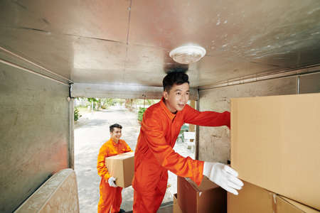 Two young adult Asian men working in modern house moving service lifting boxes into van, horizontal shot