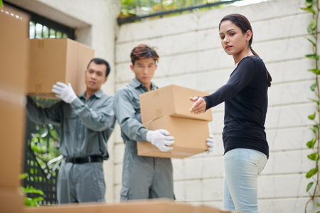 Smiling mature Vietnamese woman telling movers where to carry heavy leather sofa