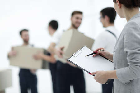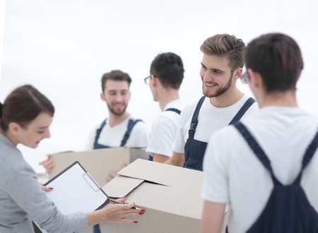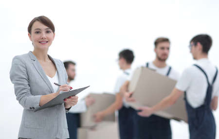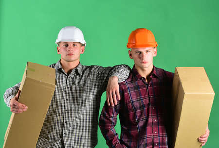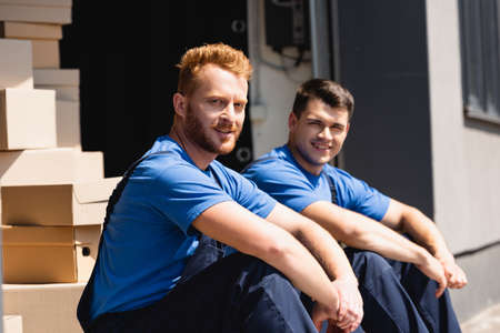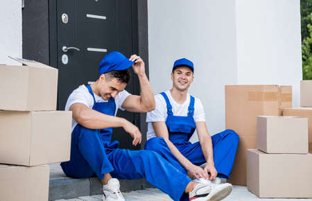 Satisfied and proud movers leaning on stack of boxes isolated on