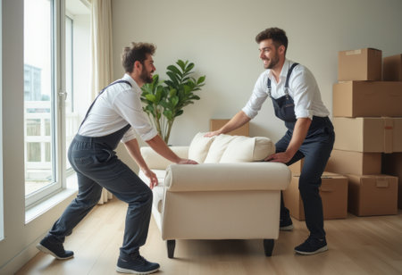 In a bright, airy room filled with moving boxes, two friends are joyfully maneuvering a cozy white couch. Their teamwork shines as they share smiles, showcasing camaraderie and the excitement of a new beginning amidst the chaos of relocation.