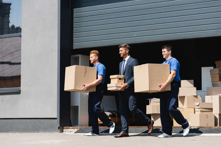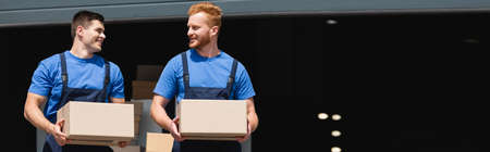 Panoramic orientation of movers holding cardboard boxes and looking at each other on urban street