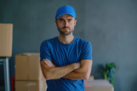 Deliveryman in blue cap and t shirt poses as courier with folded hands for dealer job