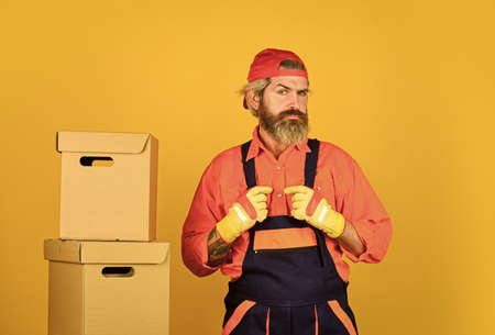Future profession. Moving house day. think outside the box. express delivery concept. Man worker in boilersuit at box. moving to new apartment. New Wave of Living. box for tools. Moving concept