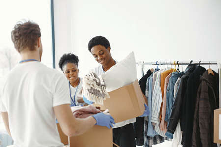 Volunteers work at a charity foundation, a refugee assistance center. A group of happy people unload cardboard boxes and donation boxes from the car for distribution to those in need.