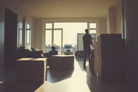 People moving boxes and furniture into a new home, a moving truck in the background, light scattered boxes on the floor.