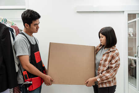 Home delivery service and working with service mind, Woman customer signing and receiving a cardboard boxes parcel from deliveryman.