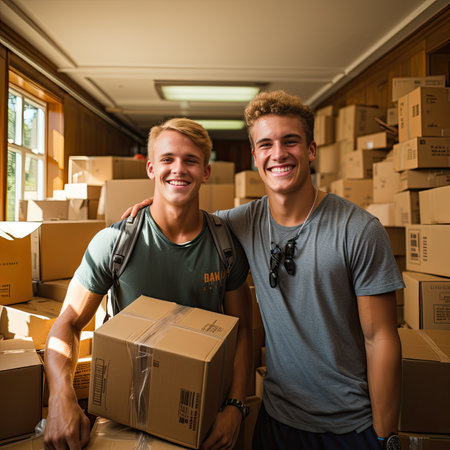 Group of friends moving into new apartments or new dorm room with sunlight, carrying boxes and arranging furniture. Moving process enjoyable and efficient.