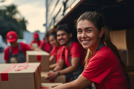 Workers loading cardboard boxes into a delivery truck. Online orders, warehouse logistics, e-commerce fulfillment.