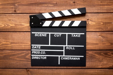 Opened clapper board or slate film on wooden background.