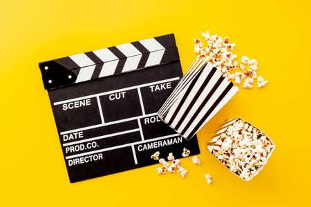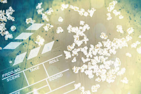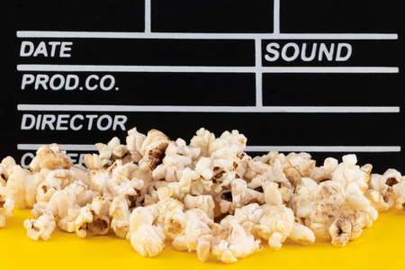 Clapper board with popcorn. Movie concept. Clapperboard on a textural background. Close-up.