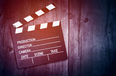 Vintage photo of movie clapper on wood background.