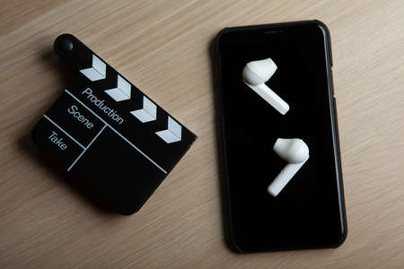 image of mobile phone clapper board headphone