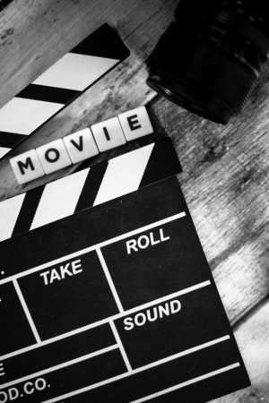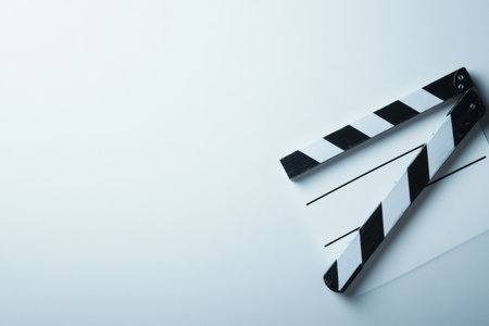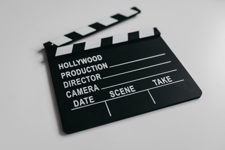 A clapperboard is positioned from above against a bright white backdrop, symbolizing the beginning of a movie-making adventure.