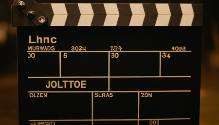 A clapperboard rests on a black background, prepared for the start of a new film project, indicating the scene and take numbers.