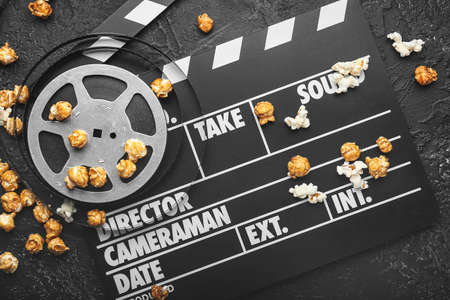 Popcorn with clapperboard and movie film reel. Cinema background