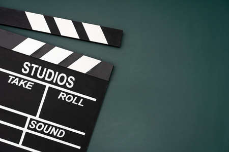 Filmmaking concept. Movie Clapperboard. Cinema begins with movie clappers. Top view. Copy space. Place for your text.