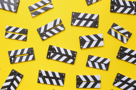 Black and white clapper boards on yellow background with stripes for filmmaking and media production