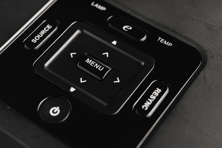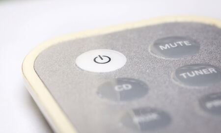 Selective focus, details of TV remote control buttons. Bucharest, Romania, 2021.