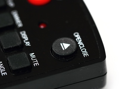 A close up portrait of the record button of a television or other multimedia device to start recording sound or a series or movie. it is surrounded by the buttons needed to play it again.