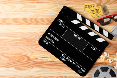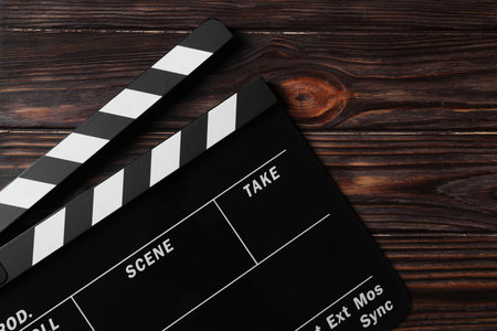 a Clapperboard lies on a wooden background