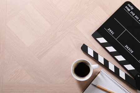 Movie clapper, coffee, notebook and pen on wooden table, flat lay. Space for text