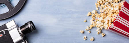 Old-school projector reel with uncoiled film is leaning against paper bucket of caramel popcorn in side warm light of lamp, front view. Traditional attributes of watching movies