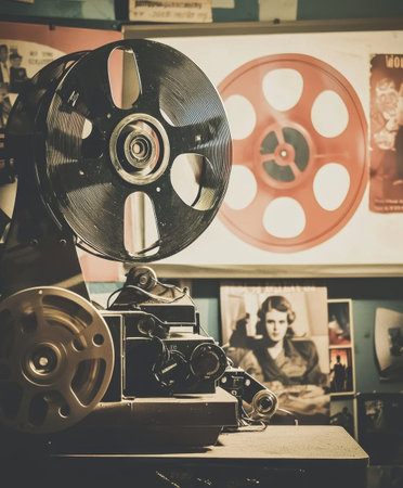 Vintage Movie Marathon Night with Retro Film Projector and Reels A nostalgic scene capturing the essence of classic cinema and the timeless allure of analog media
