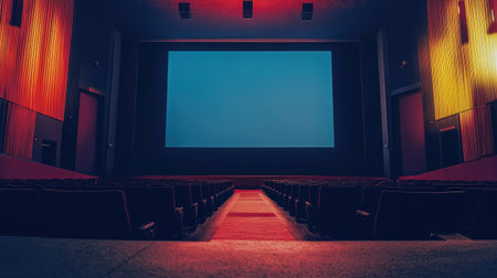 An empty theater showcasing a large blank screen, surrounded by ambient lighting. The serene atmosphere invites viewers to imagine their cinematic experience.