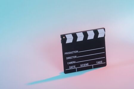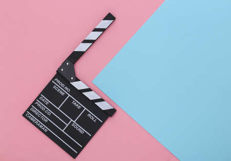 Movie clapper board on a blue-pink pastel background. Filmmaking, Movie production, Entertainment industry. top view