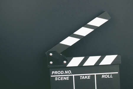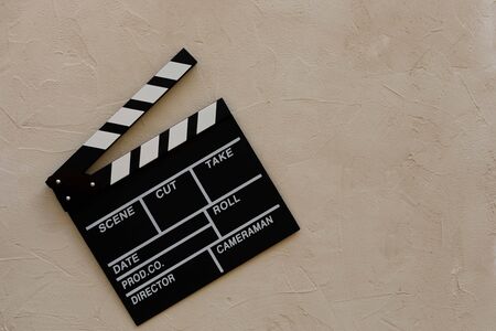 Filmmaking concept. Movie Clapperboard. Cinema begins with movie clappers. Top view. Copy space. Place for your text.