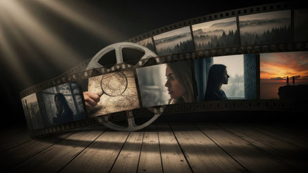 A film reel is the central element, displaying a series of images including landscapes and portraits. The visuals are enhanced with dramatic lighting and a wooden floor. This composition suggests concepts of storytelling, cinema, and production. Suitable for creative projects and editorial content.