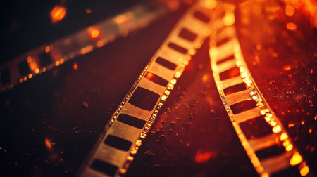A detailed image presents a curled film strip, illuminated with focused light. The film's surface reveals intricate frames and patterns, with a play of light and shadow adding depth. The composition suggests a studio setting, suitable for visual media or conceptual applications. It's ideal for projects that require a cinematic or vintage aesthetic.