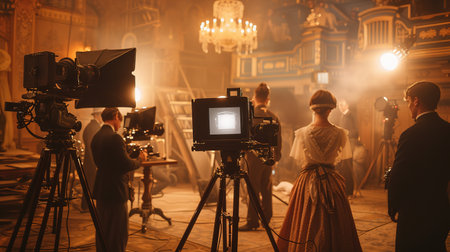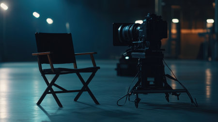 A clapperboard sits prominently, ready for action as bright lights illuminate the filming area, setting an energetic production mood.