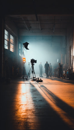 Film crew shooting movie scene in abandoned factory. Filming crew with professional camera equipment.