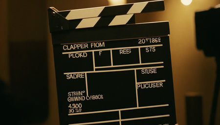 A clapperboard rests on a black background, prepared for the start of a new film project, indicating the scene and take numbers.