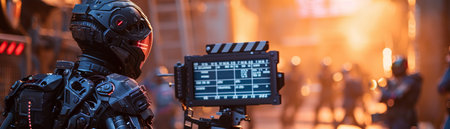 Black cyborgs on movie set, AI directing, close view, cameras and film clapperboards