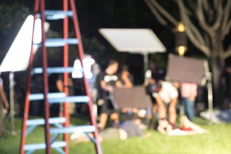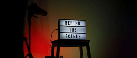 Behind the scenes text on Lightbox or Cinema Light box. Movie board light box on studio stair and light Snoot tripod on colors gradiant Background. Represent behind the scenes team is working on.