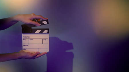Blurry images of movie slate or clapper board. Hand holds empty film making clapperboard on color background in studio for film movie shooting or recording.