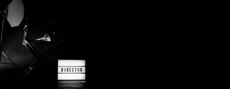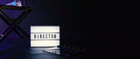 Director chair with cinema lightbox sign Director text on it and clapperboard megaphone and black background studio. Director seat on video production or filming set used in film industry. Real no 3D