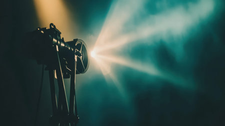 A vintage film projector casting a vibrant light beam through smoky air, perfect for capturing the essence of cinema and evoking nostalgia in artistic designs.