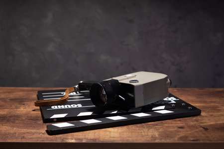 Movie clapper and old camera on a wooden background, movie shooting, film, screenplay, director