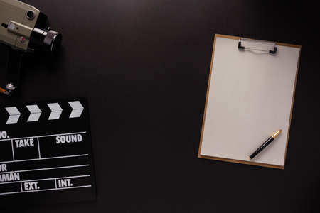 Clapboard and paper at black background texture. Movie idea concept