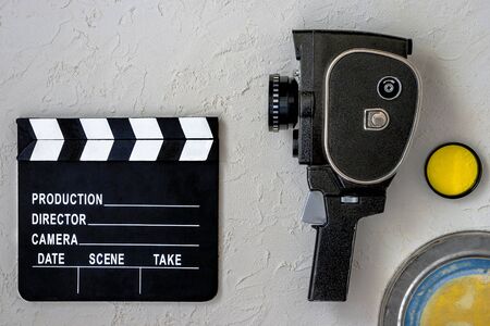 8mm movie roll of film reel with a retro movie camera on a light table. Movie clapper board for filming. Filming Accessories