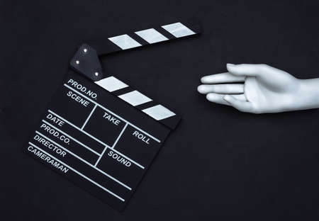 Movie clapper board and mannequin hand on black background