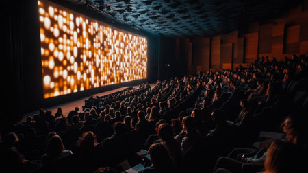 A large audience gathers in a contemporary theater to enjoy a film. The screen displays a captivating array of warm colors, enhancing the lively atmosphere.
