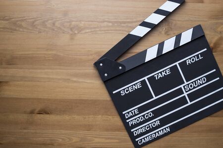 movie clapper on wood table ; film, cinema and video photography concept, flat lay