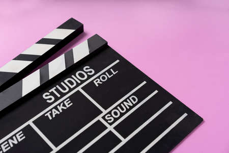 movie clapper on pink table background ; film, cinema and video photography concept